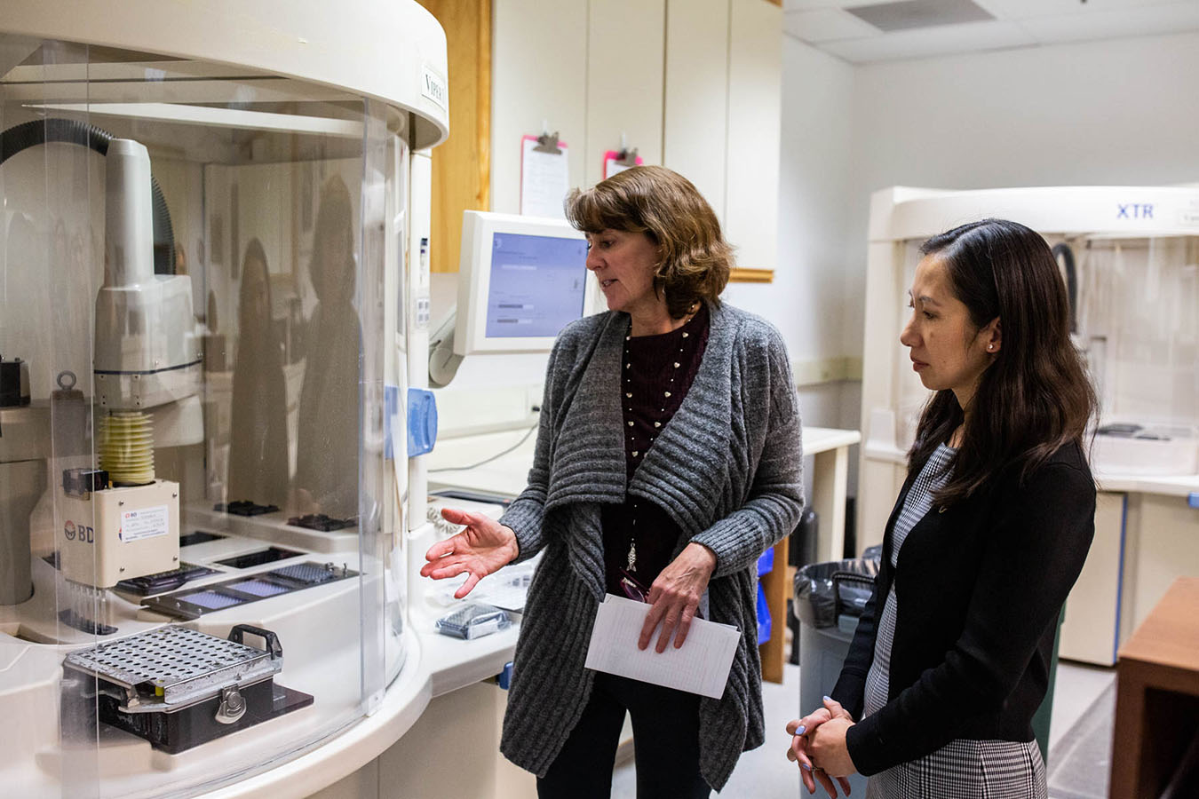 Wen tours a lab in the basement of a San Jose, Calif., clinic that processes tests for gonorrhea and chlamydia. “When I was in college, we did all the pipetting manually,” she told the staff. (Anna Maria Barry-Jester)
