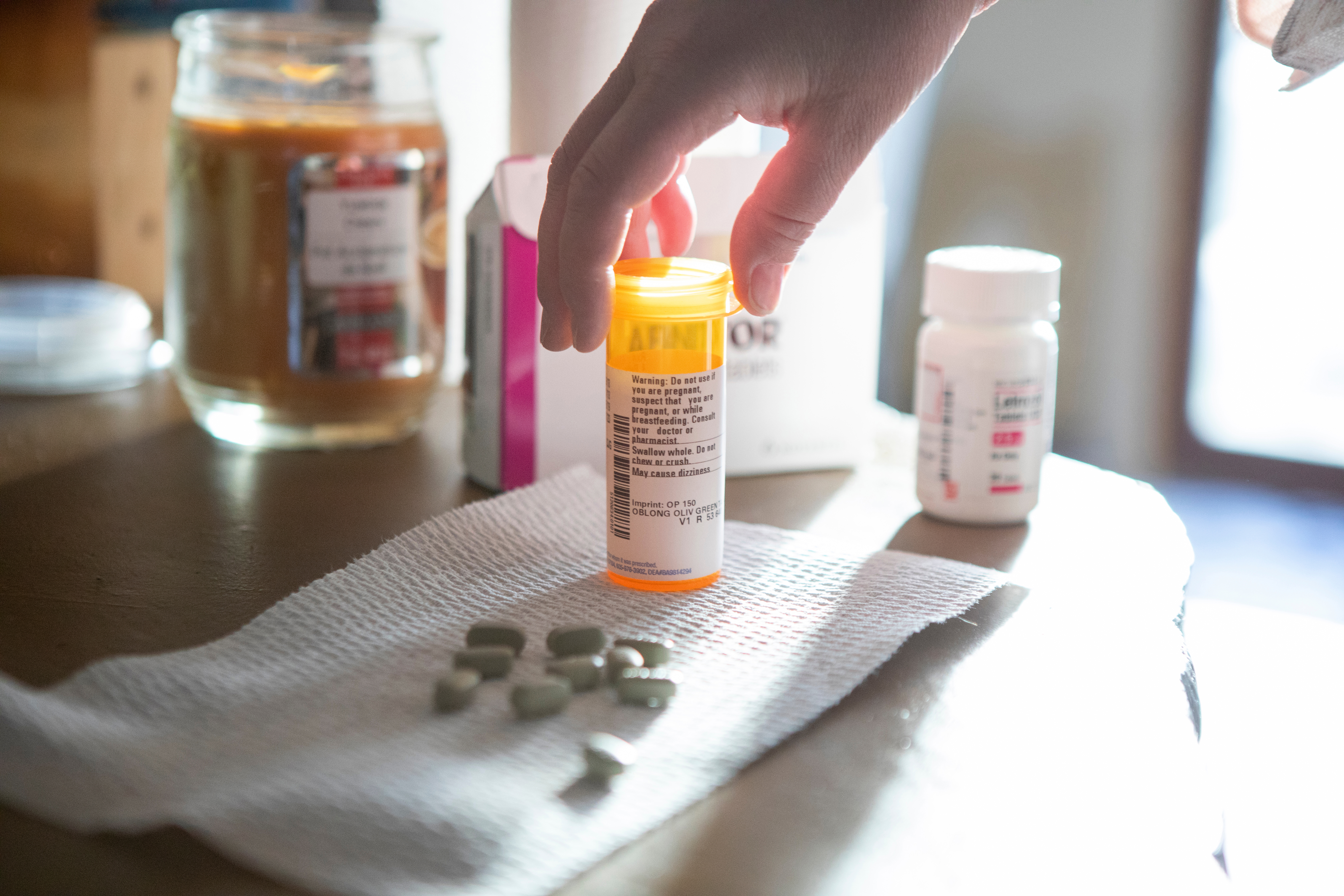 Kilmer spreads out her daily medications, including Lynparza (center).(Kristina Barker for KHN)