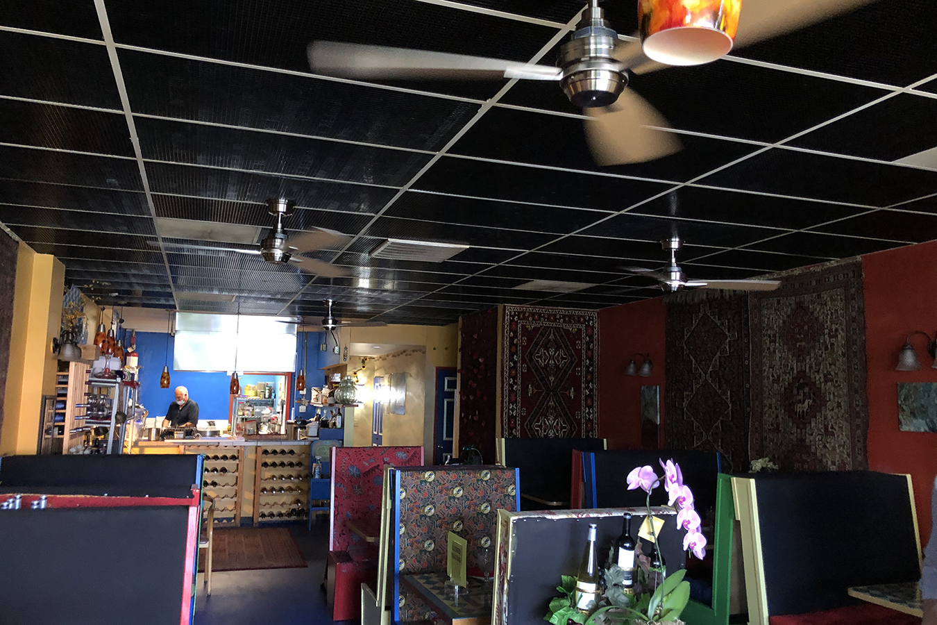 The owner, Firat, purchased four UV fixtures (at $165 each), hired an electrician to install the fans and bought black gridded plastic panels to enclose the ceiling space where the UV is mounted.