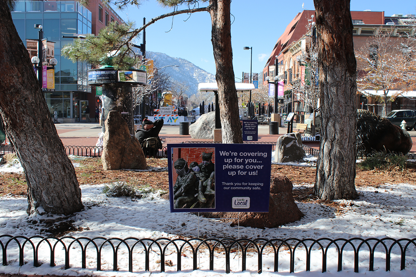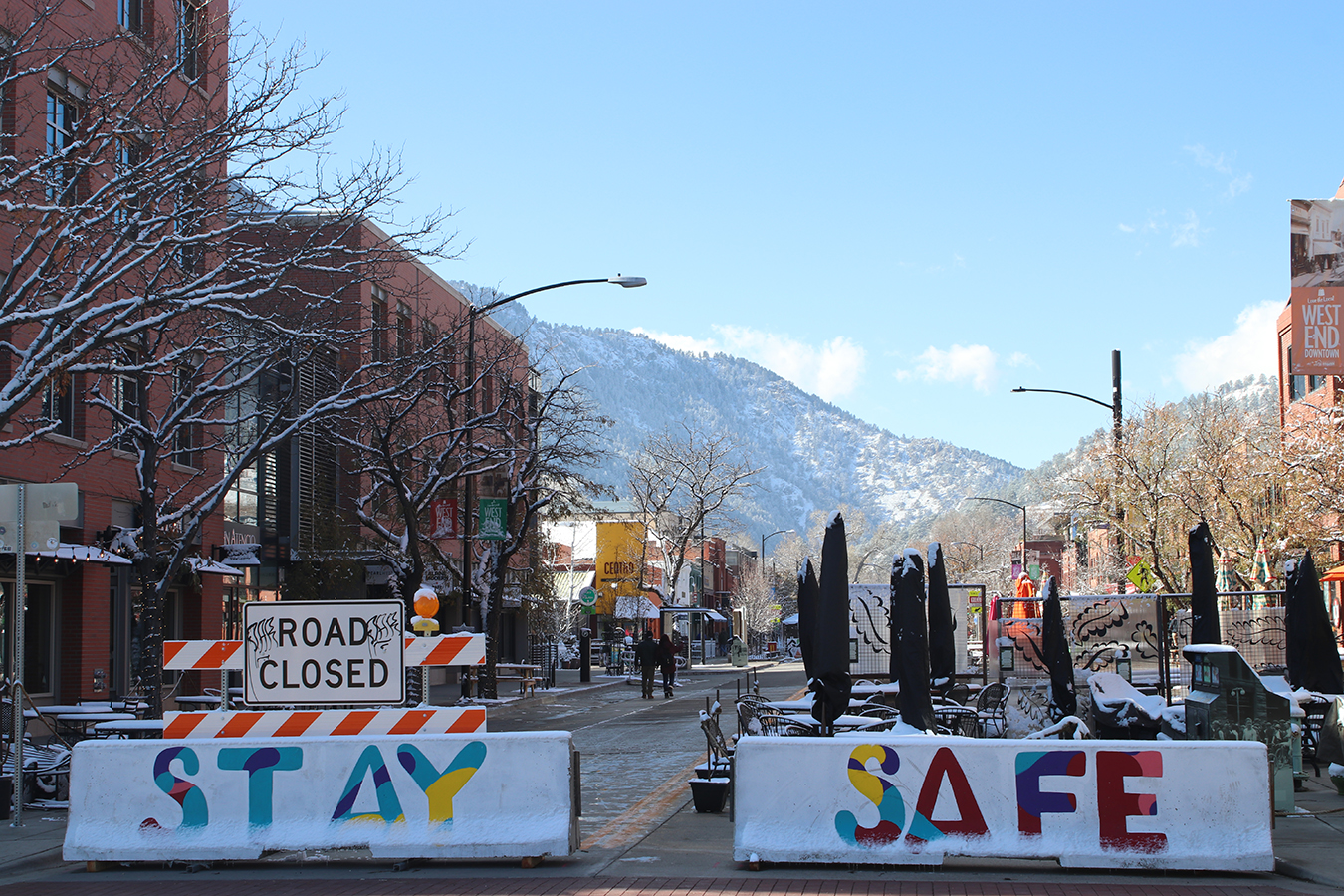 Snow-covered barriers set up along the Pearl Street Mall in Boulder, Colorado, carry a message of safety. (Markian Hawryluk/KHN)