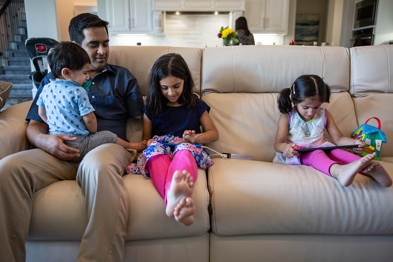 Khan cooks lunch for his wife, Ayesha, and children, Nazneen, 7, Yasmeen, 4, and Rehan, 1, in their home in Southlake, Texas. (Shelby Knowles for NPR)