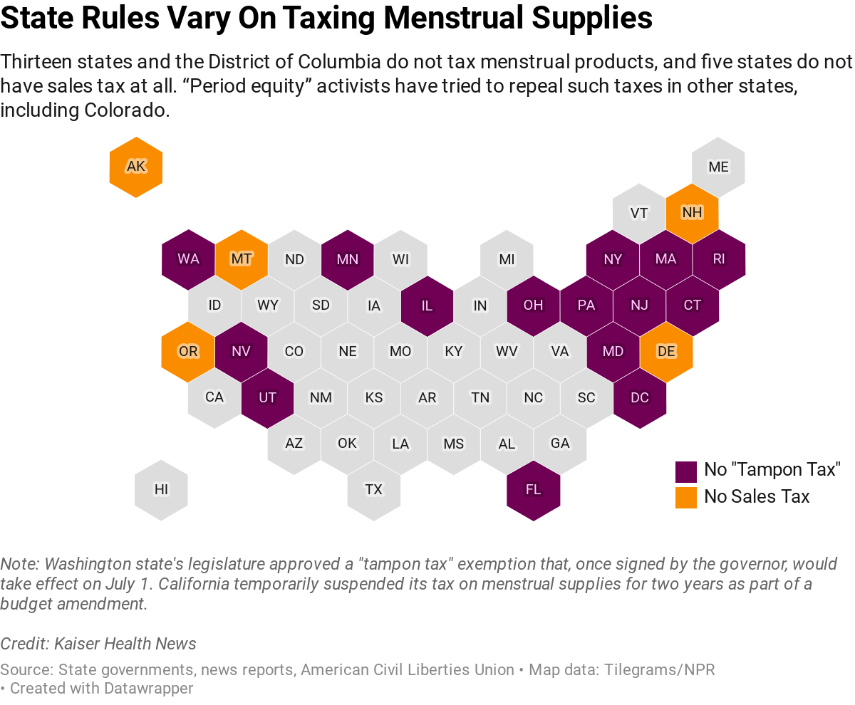 Thirteen states and the District of Columbia do not tax menstrual supplies, and five states do not have a sales tax at all. But Colorado isn’t among them — yet.