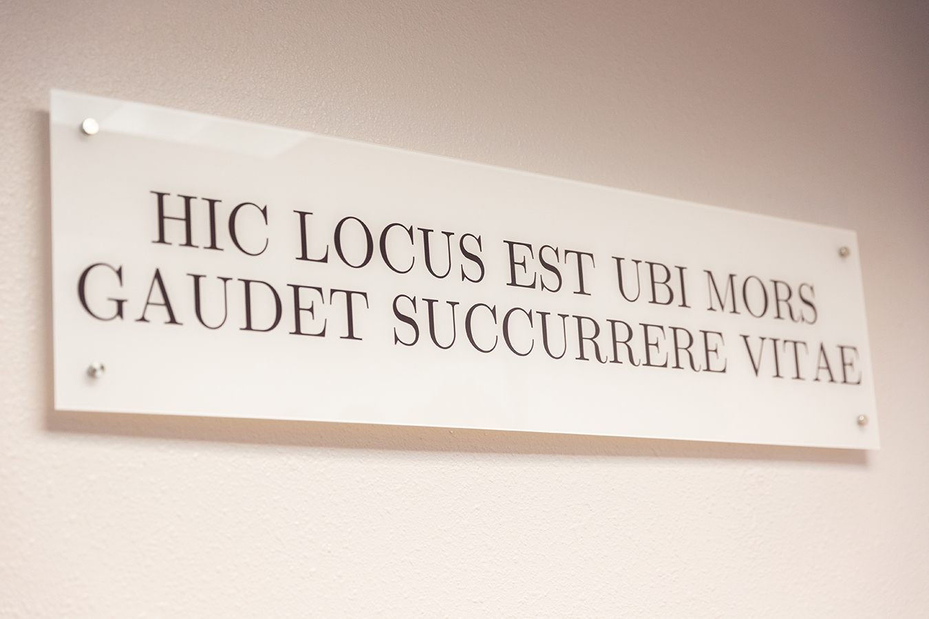 On Kimberly Repp’s office wall is a sign in Latin: Hic locus est ubi mors gaudet succurrere vitae. This is a place where the dead delight in helping the living.