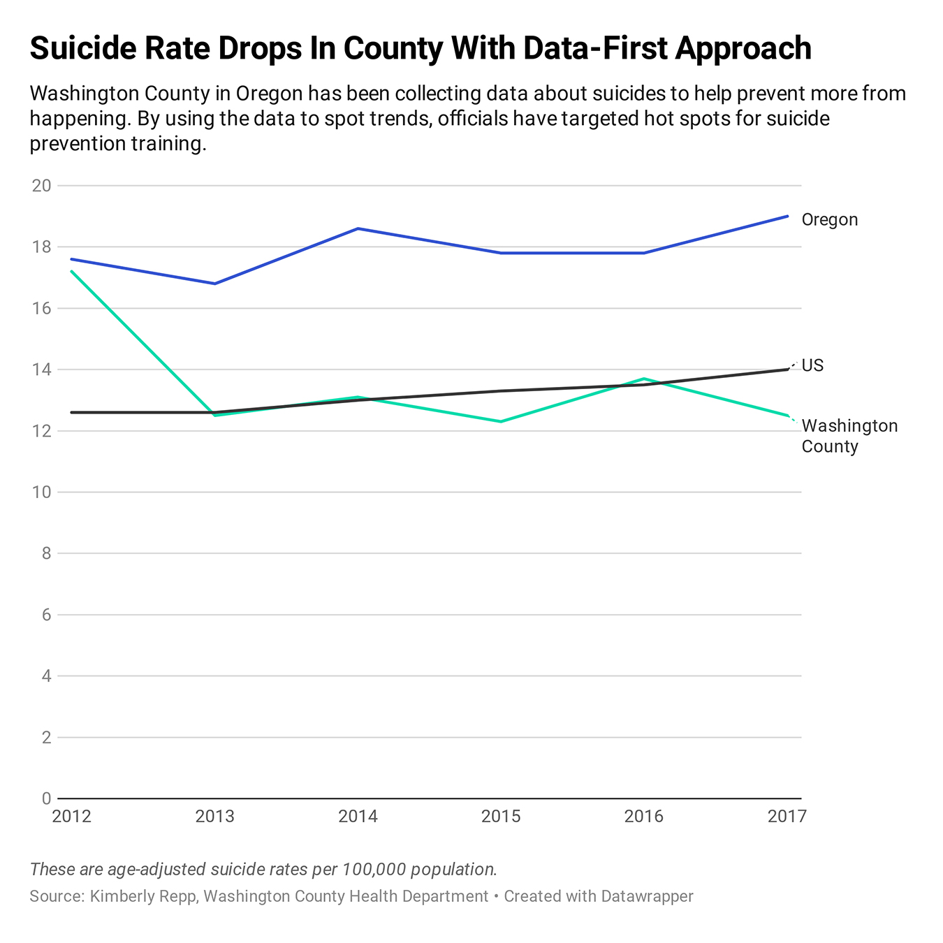 But in 2012 she was asked by county officials to look at suicide. The request led her into the world of death investigations, and it also appears to have led to something remarkable: In this suburban county of 600,000 just west of Portland, the suicide rate now is going down. It’s remarkable, because national suicide rates have risen despite decades-long efforts to reverse the deadly trend.